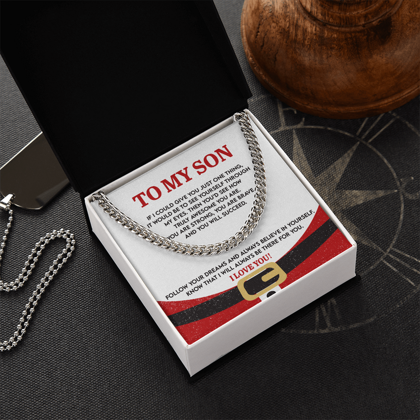 Give your son a gift that reminds him of his strength, courage, and limitless potential with this meaningful “To My Son – See Yourself Through My Eyes” Christmas message card. Featuring a fun Santa belt design paired with uplifting words of love and encouragement, this keepsake inspires confidence and reassures him that you'll always be there to support him. The perfect holiday gift from Mom or Dad to show how proud you are of the young man he is becoming.